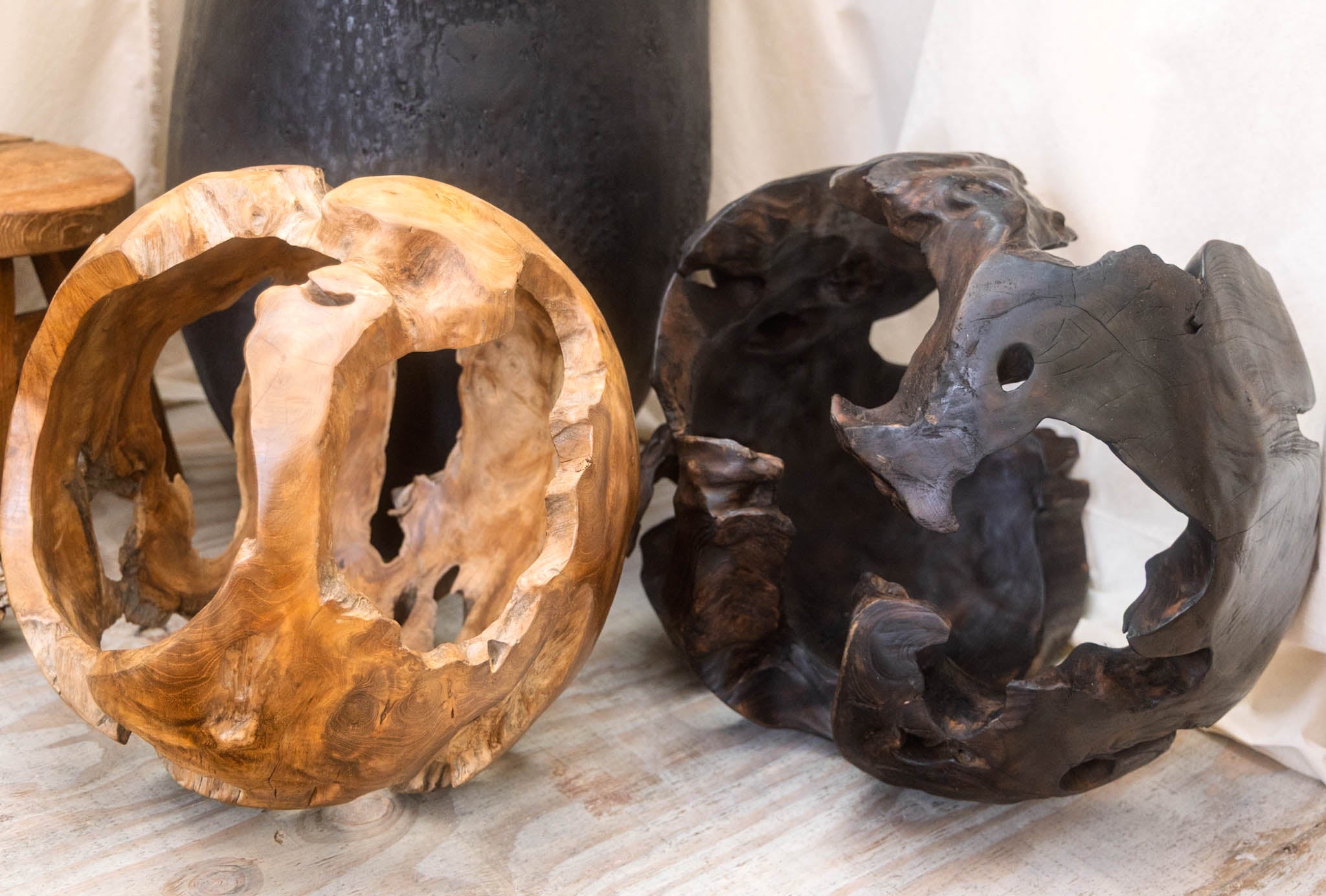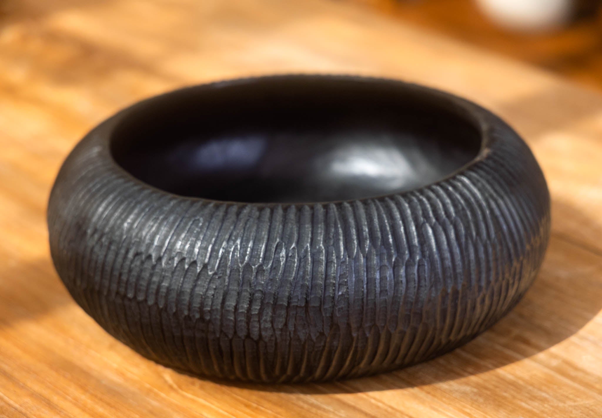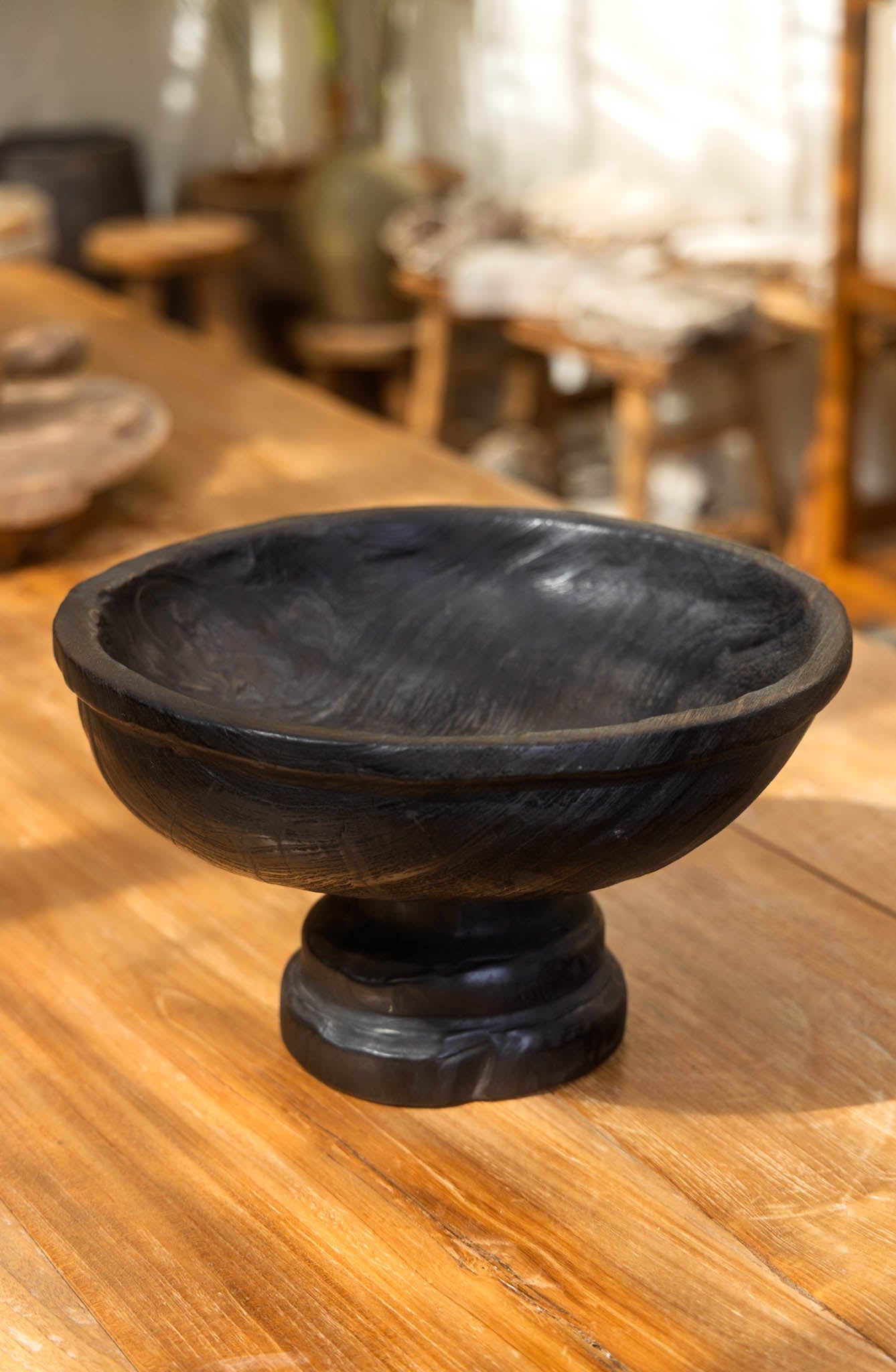 Carved from solid teak, the bowl rests on a sculpted base. Finished in a burnt black patina. Both functional and sculptural.