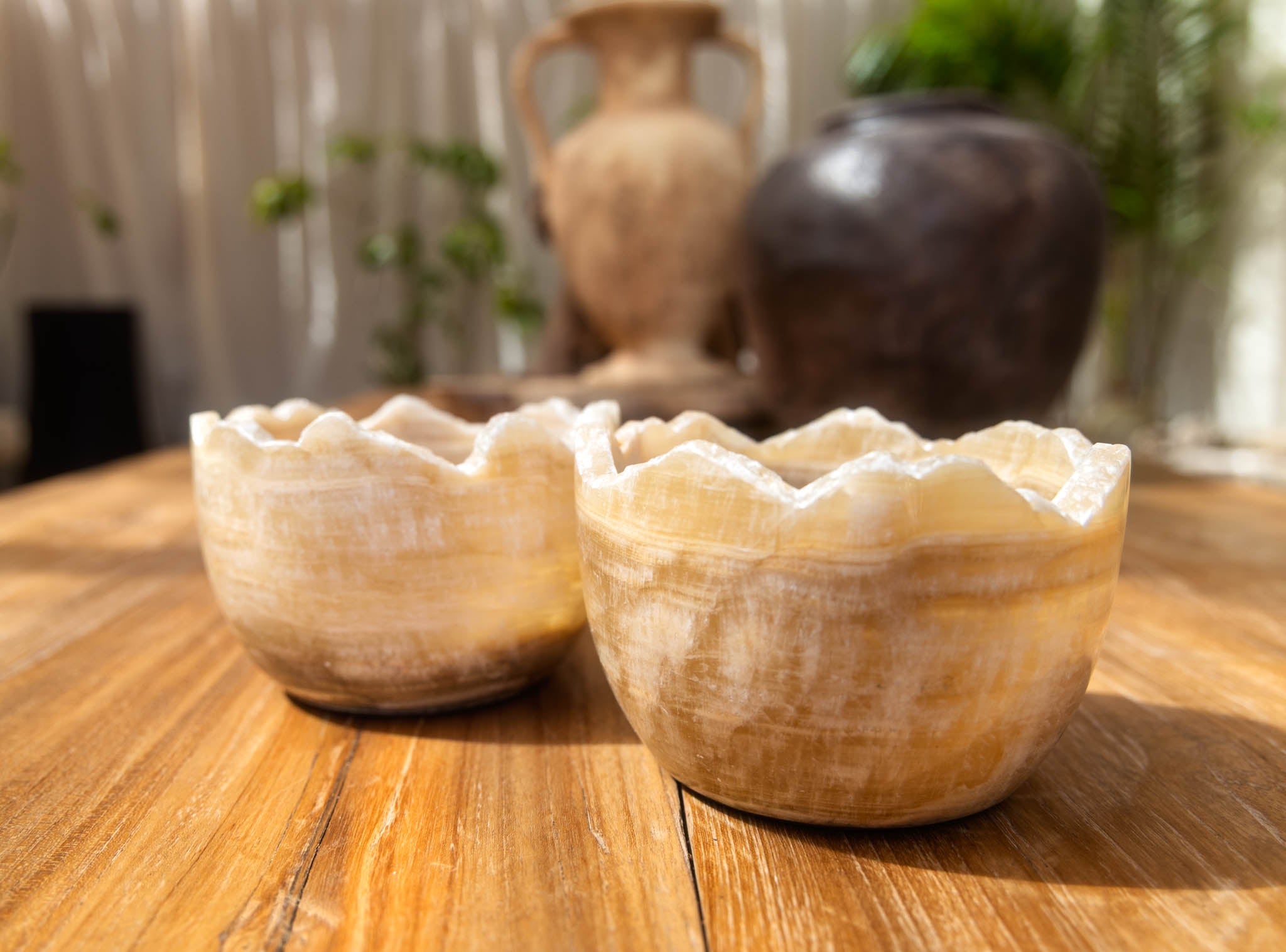 Shaped from natural onyx, each bowl features unique veining and a scalloped rim. Perfect for serving, styling, or as a decorative accent.