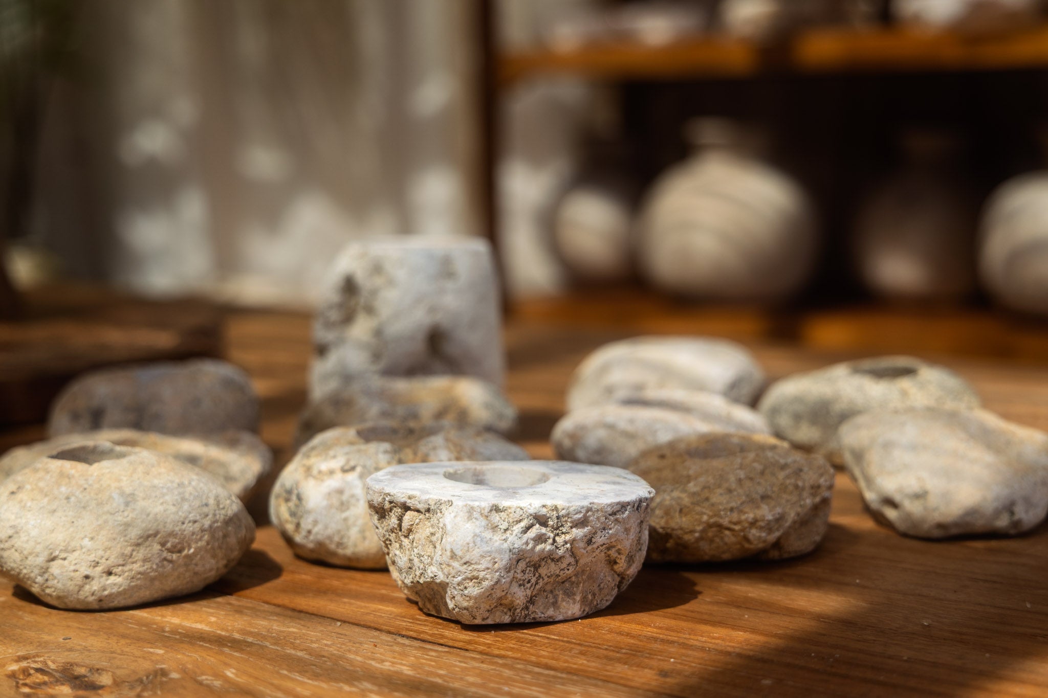 Carved from natural marble, each piece retains its raw, organic form and holds a single tea light candle.