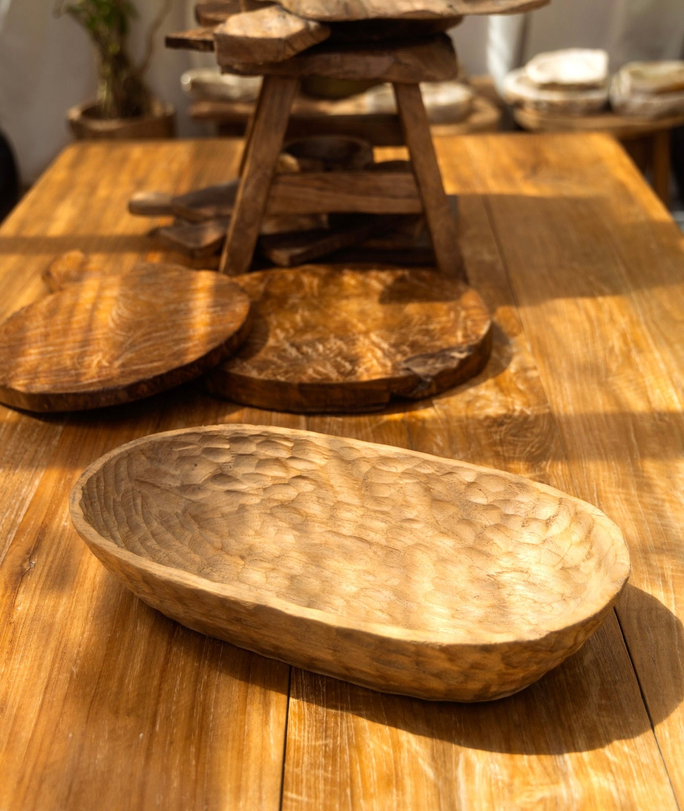 Shaped from one solid piece of teak wood. Use for presenting food or layering decor.