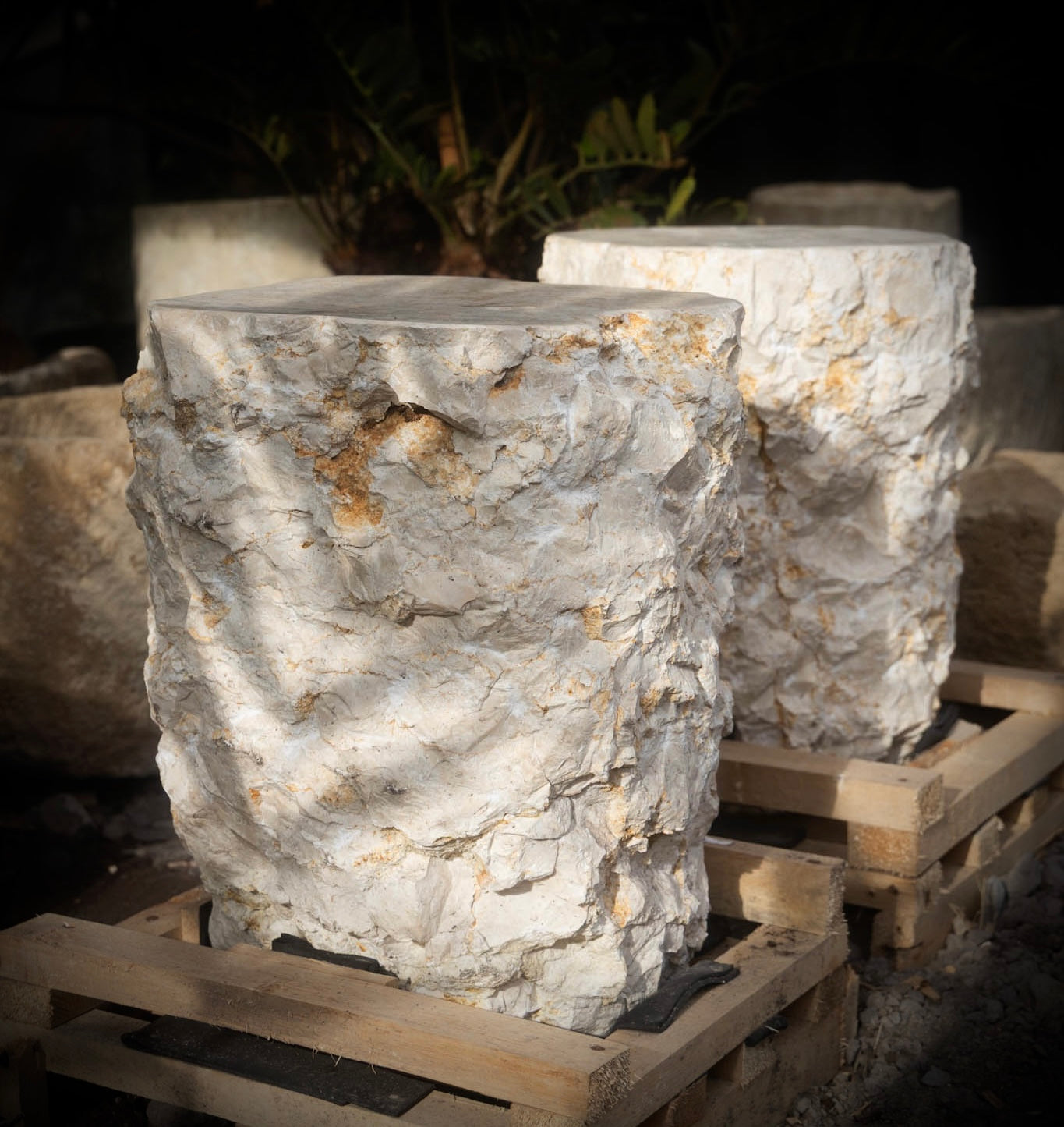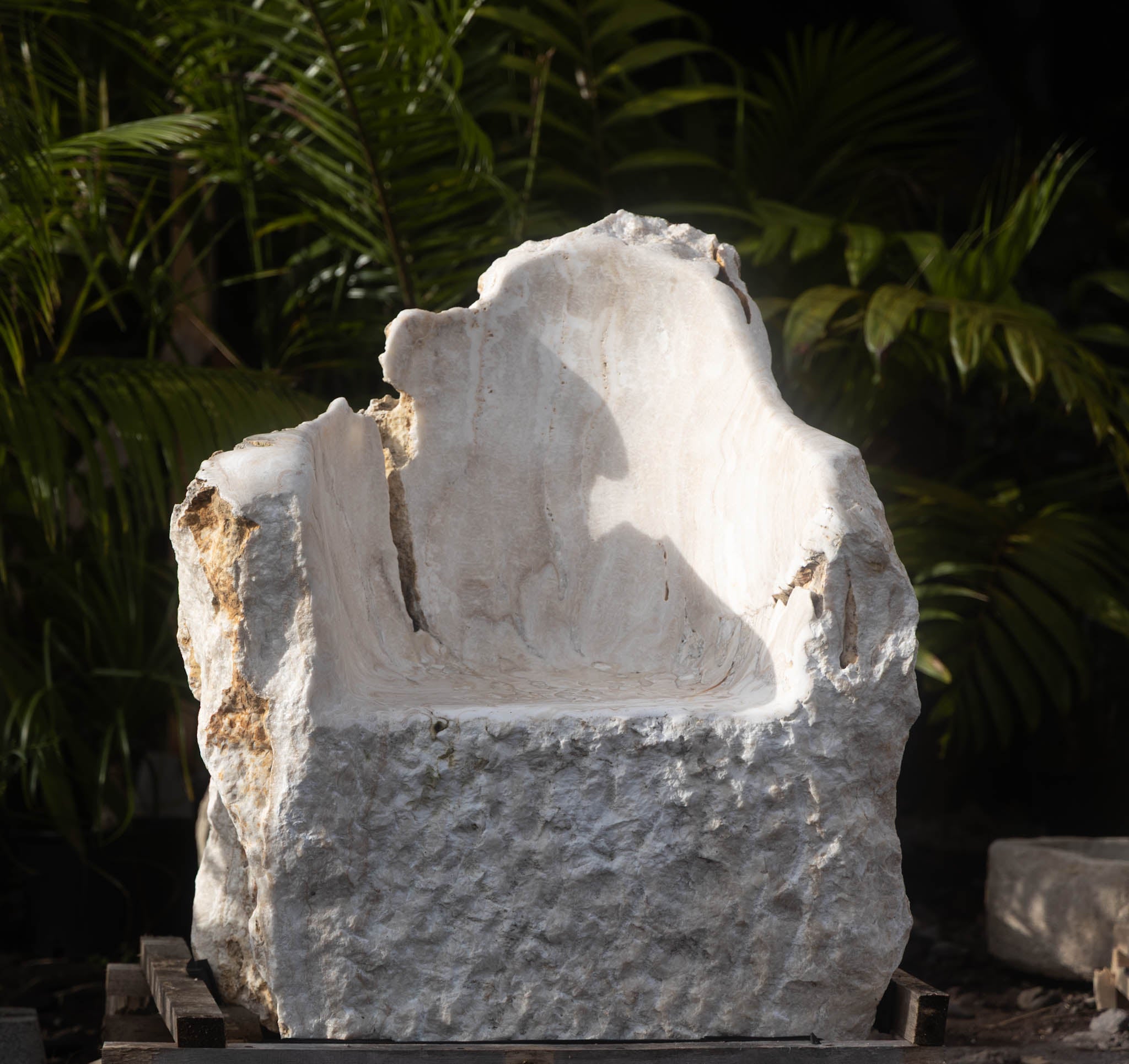 Solid marble with rough, organic edges and a leveled top. Ideal as a table, stand, or sculptural accent.
