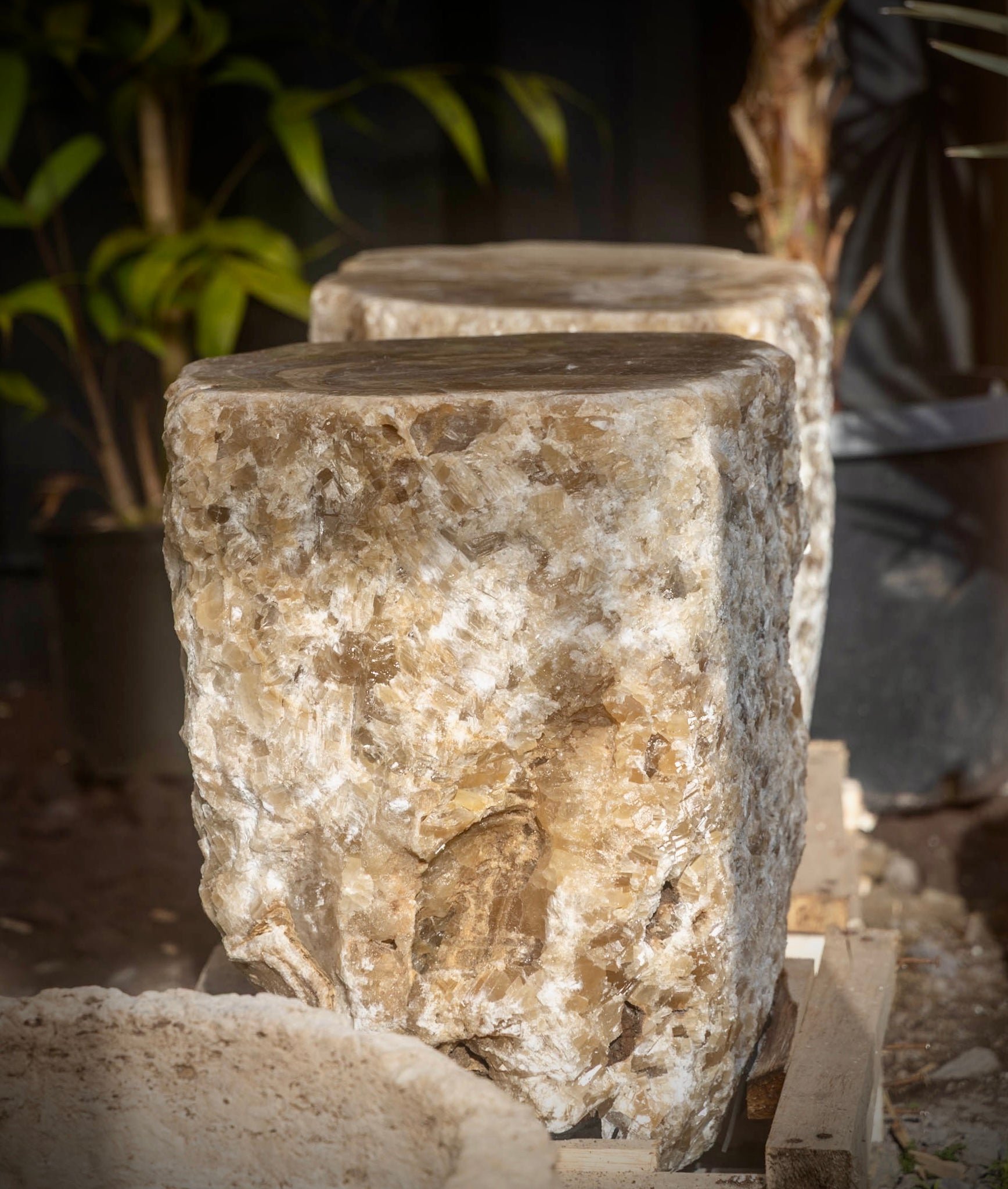 Shaped from solid onyx with natural veining and crystal formations. May be used as a side table, stool, or pedestal.