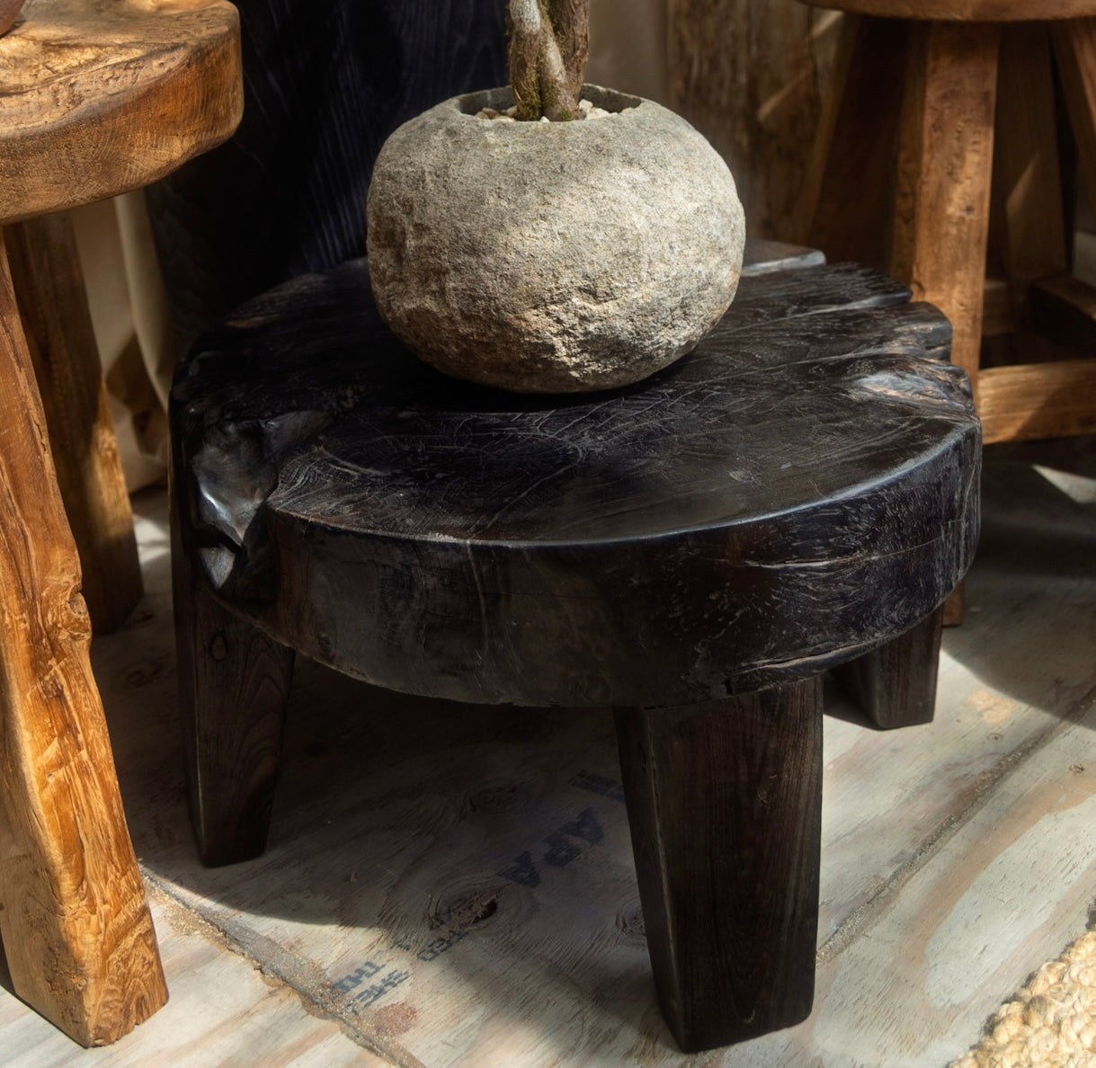 Made from solid teak with a burnt finish. Perfect as a low side table or as a plant stand.