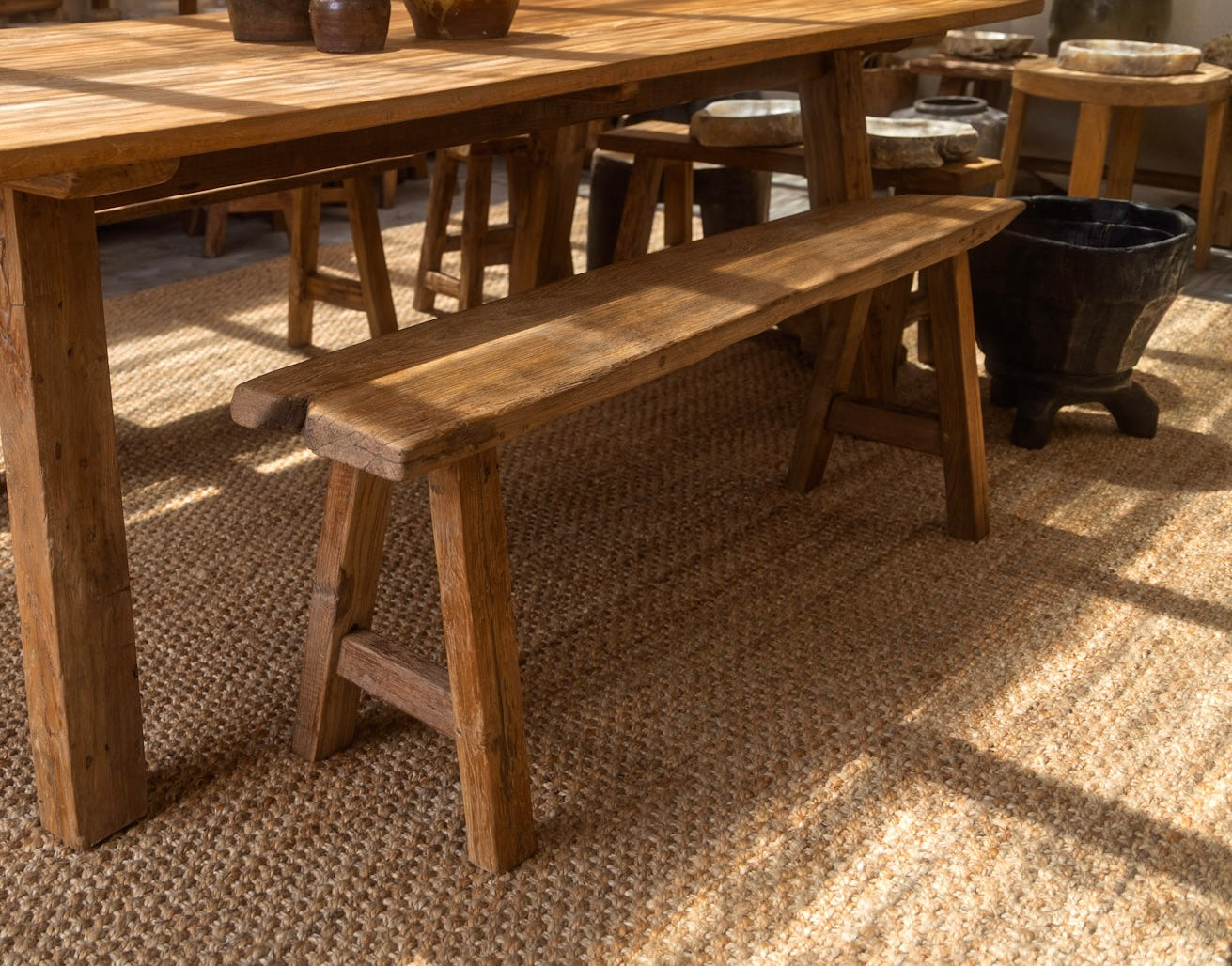 Made from old teak wood, this bench shows natural character and age.