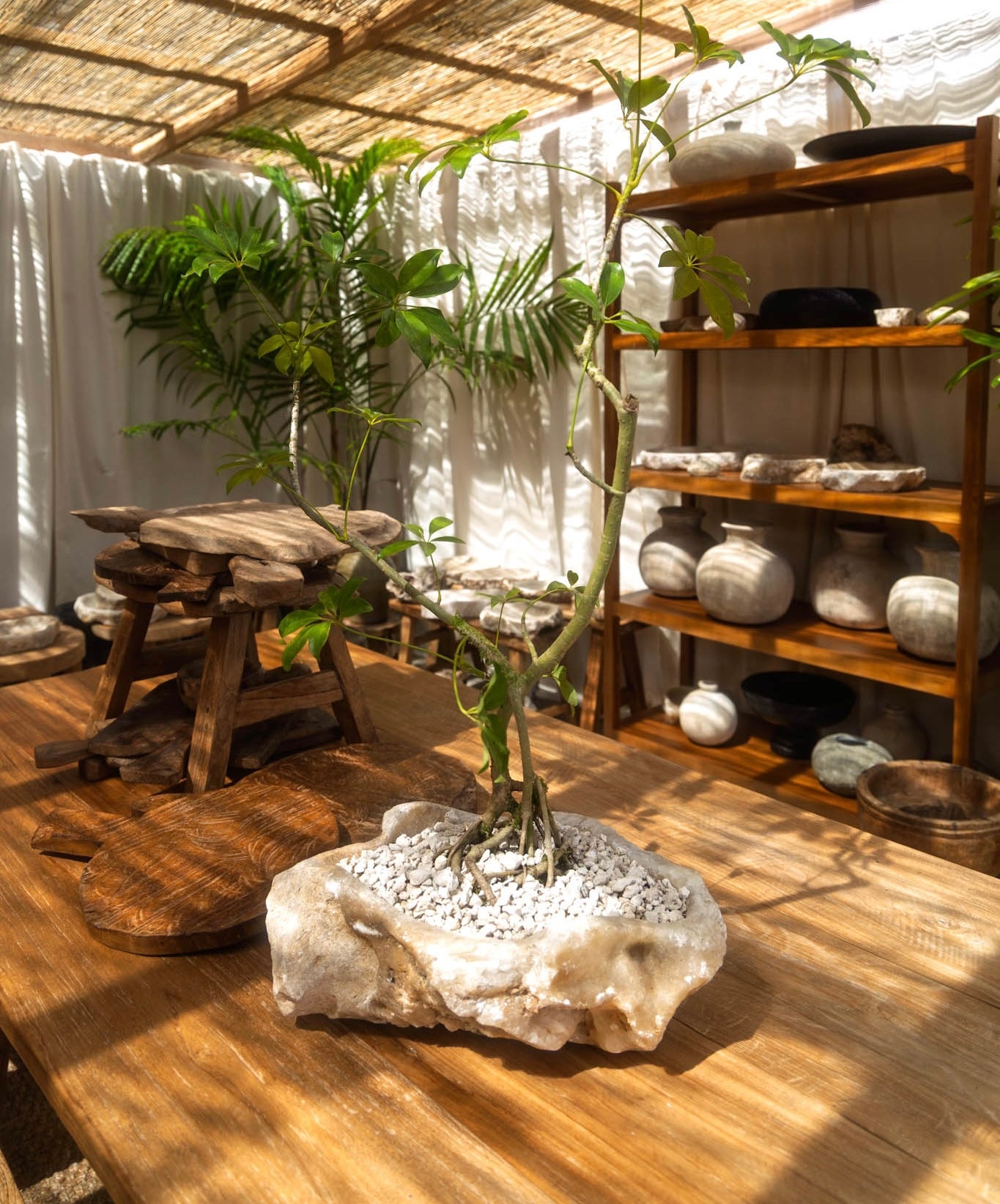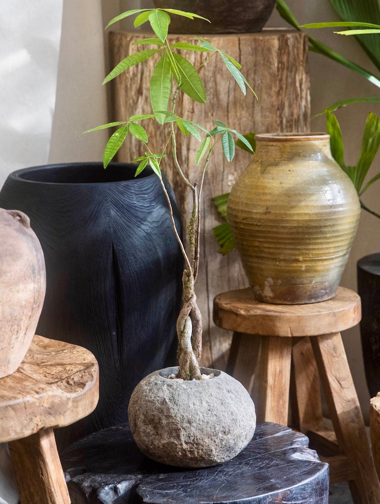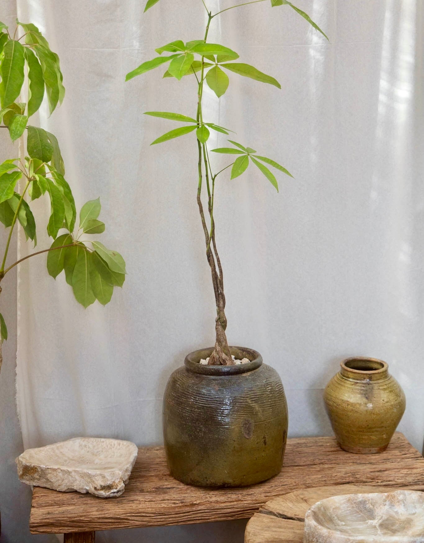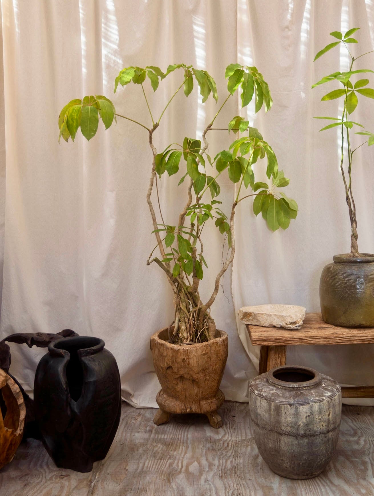A sculptural schefflera tree paired with a vintage teak mortar planter.
