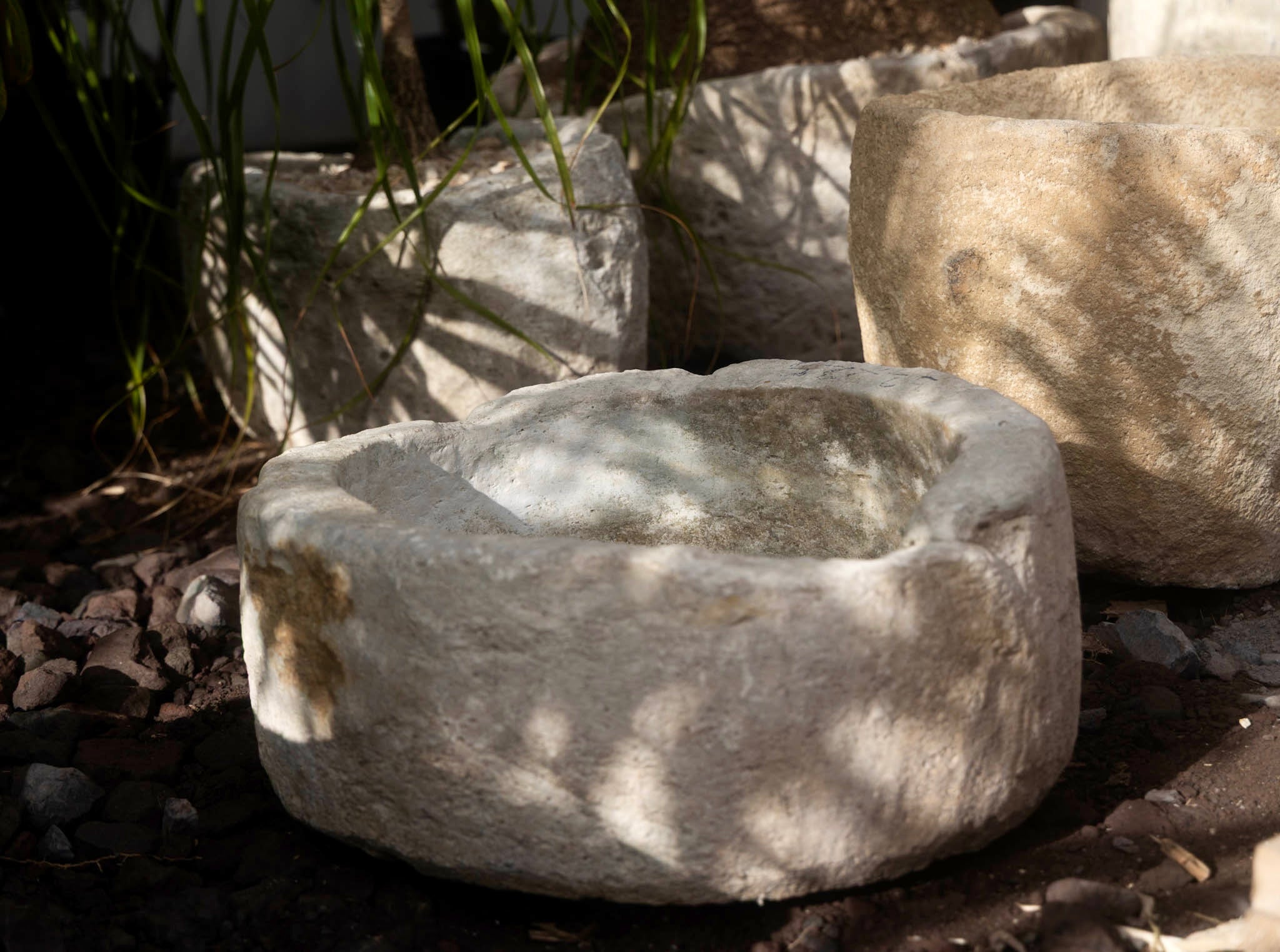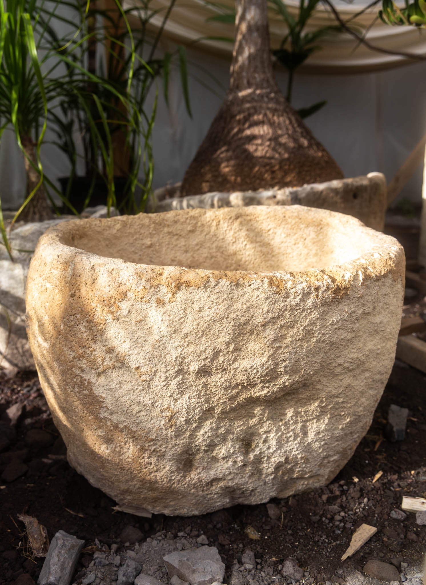 Once used for water storage, this hand-carved limestone trough has a natural, weathered patina. Ideal as a planter or as a statement piece for outdoor décor.