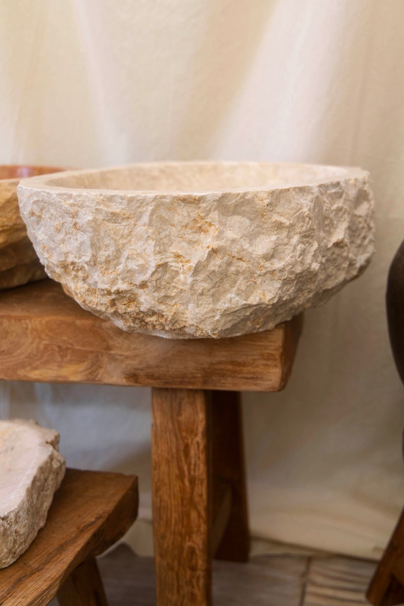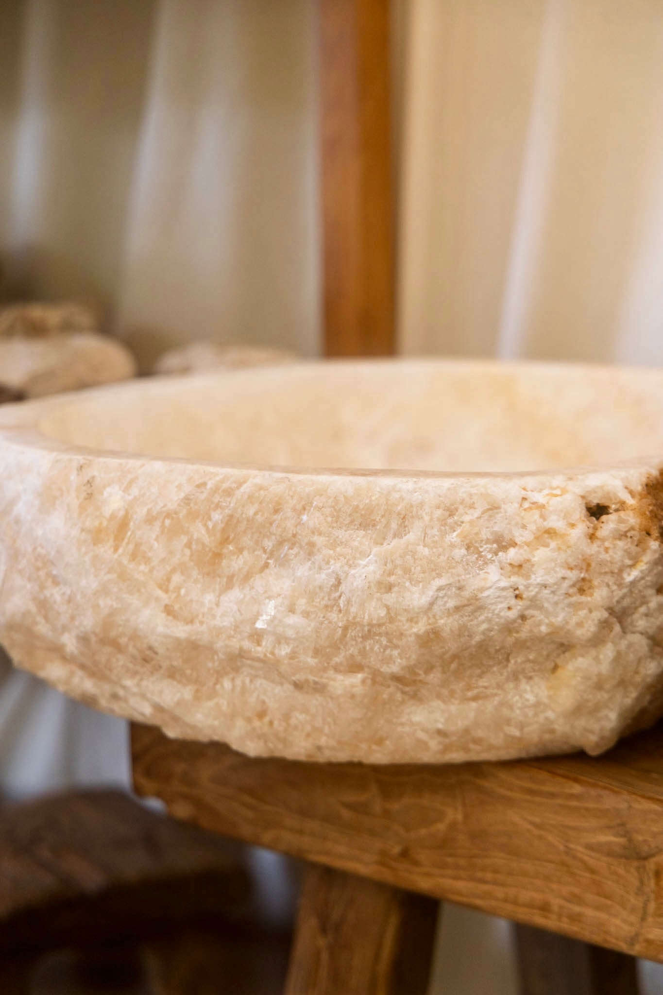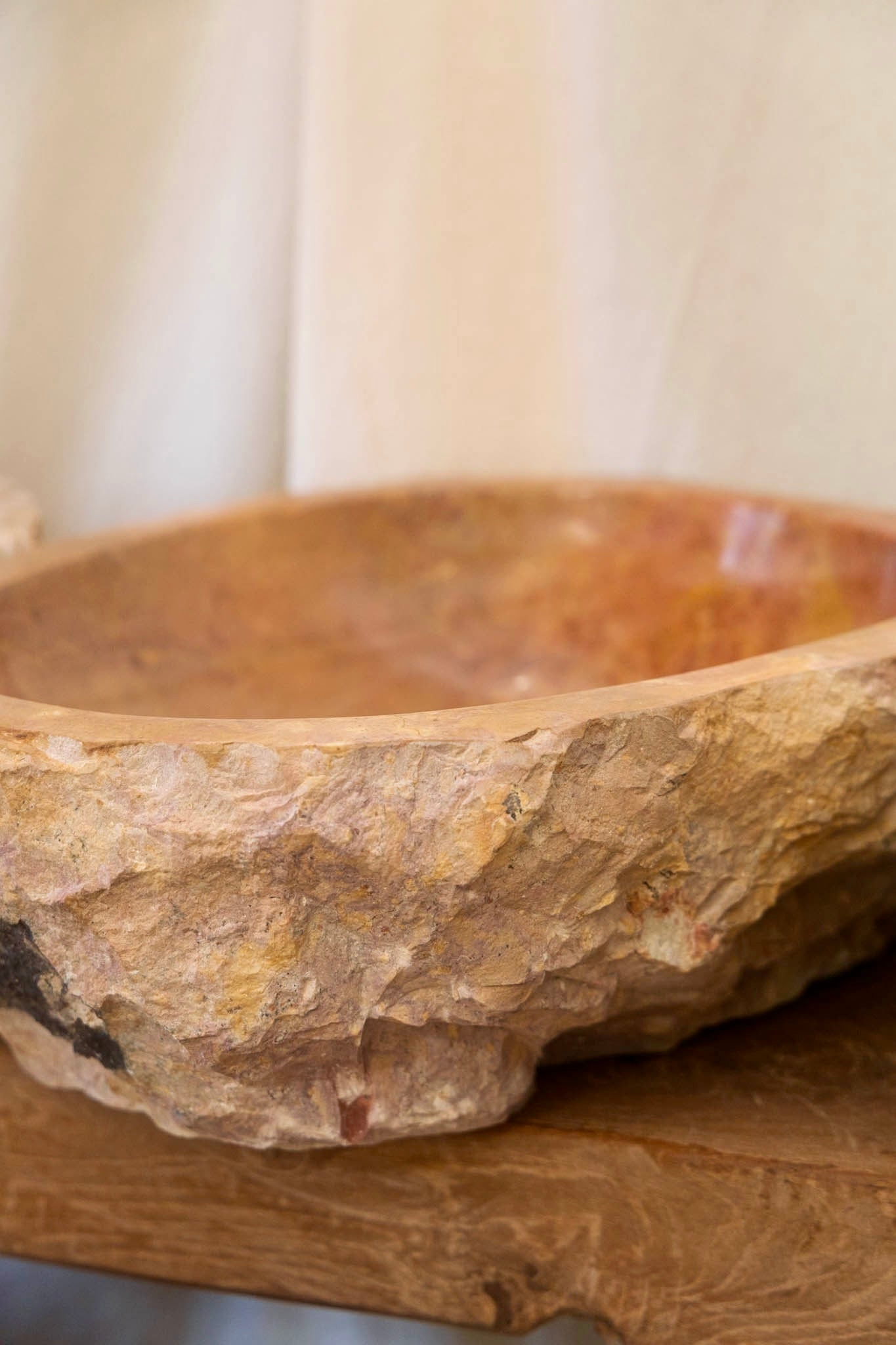 Carved from solid marble with an organic outer surface and polished interior.